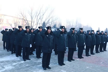 隨著鏗鏘的警歌響起,中國(guó)人民警察警旗在北國(guó)冰雪中冉冉升起。民警輔警代表整裝列隊(duì),警容嚴(yán)整,面向警旗莊嚴(yán)敬禮并宣誓。