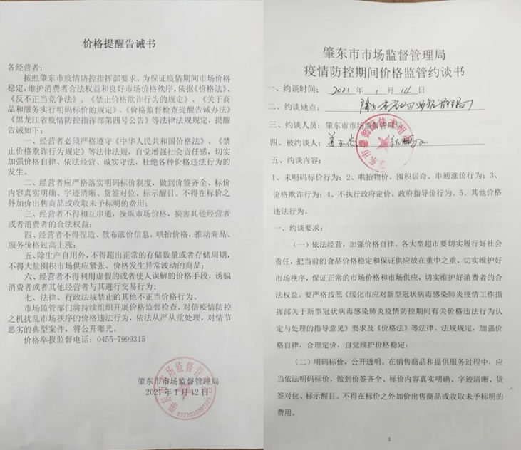 同時,對全市9個大中型超市負(fù)責(zé)人進(jìn)行約談,并在《價格監(jiān)管約談書》上簽字。各基層分局監(jiān)管人員分別深入轄區(qū)經(jīng)營商戶,發(fā)放《價格提醒告誡書》2200余份,宣傳疫情防控知識和價格管理相關(guān)的法律法規(guī),要求各市場主體遵紀(jì)守法,自覺維護(hù)市場秩序,為全市抗擊疫情貢獻(xiàn)自身力量。