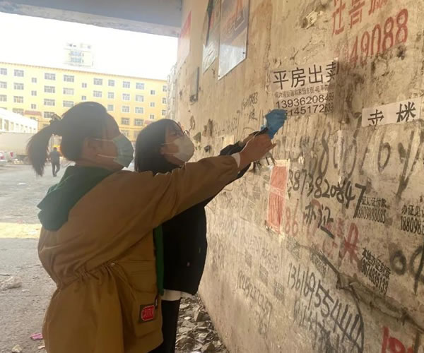 4月28日上午,市婦聯(lián)副主席宮麗紅、市婦兒辦副主任于倩共五名干部到包聯(lián)的果菜小區(qū)開展清除小廣告志愿服務(wù)。