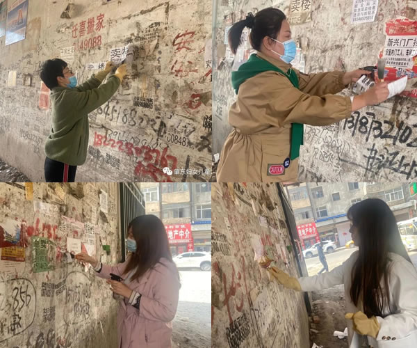 這次活動雖小,卻體現(xiàn)著婦聯(lián)干部的為民情懷。由于小廣告的數(shù)量太多而且粘的太牢,給清理工作帶來了一定的難度,志愿者只能用水噴灑在上面,再用小鏟進行清理,由于天氣還沒有完全回暖,依然很冷,志愿者們卻沒有抱怨,都積極投入工作,大約兩個小時才將指定廣告清理完畢。