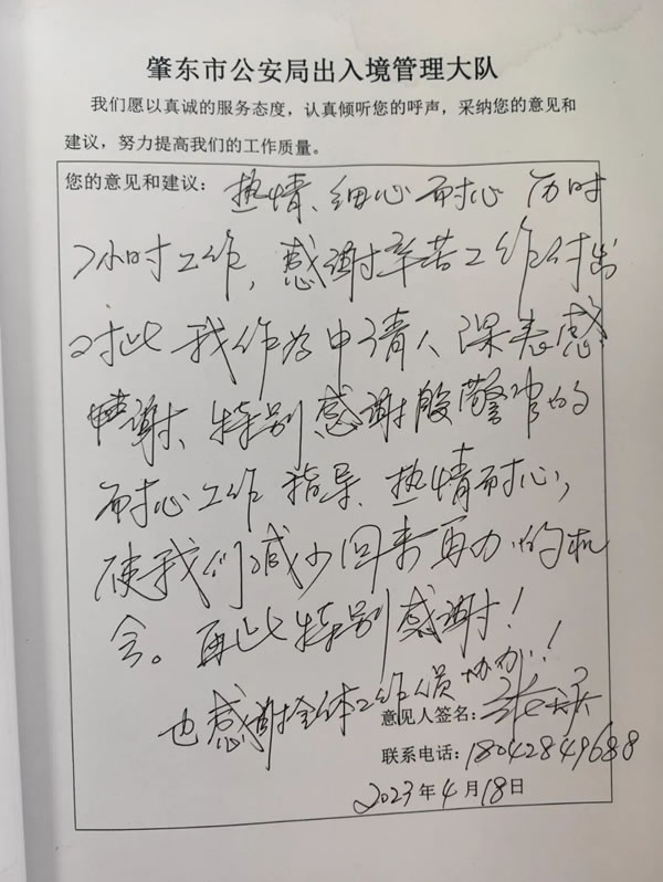 4月18日,從香港返鄉(xiāng)的肇東籍居民張先生攜妻子陳女士來到肇東市公安局出入境接待大廳,妻子陳女士是香港人,兩人此次是專程飛回來辦理張先生赴香港定居手續(xù),為了不耽誤二人的返程時間,辦證民警加班加點忙碌兩個多小時為張先生辦理通過所需辦證材料,張先生感動不已,連連說:“家鄉(xiāng)人太好了,你們出入境民警太暖心了!”當(dāng)即寫下一封感謝信表達心情。