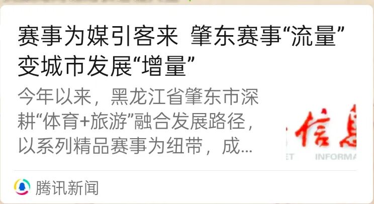 近日,肇東市以系列精品賽事為核心的文體旅融合發(fā)展模式引發(fā)多家媒體集中關(guān)注,今日頭條、騰訊新聞、搜狐新聞、百度、市場(chǎng)信息報(bào)信息快訊等多家媒體相繼聚焦其賽事經(jīng)濟(jì)成效進(jìn)行專(zhuān)題報(bào)道,讓肇東“以賽促游、以游興城”的發(fā)展故事成為矚目焦點(diǎn),賽事經(jīng)濟(jì)成為城市的新名片。
