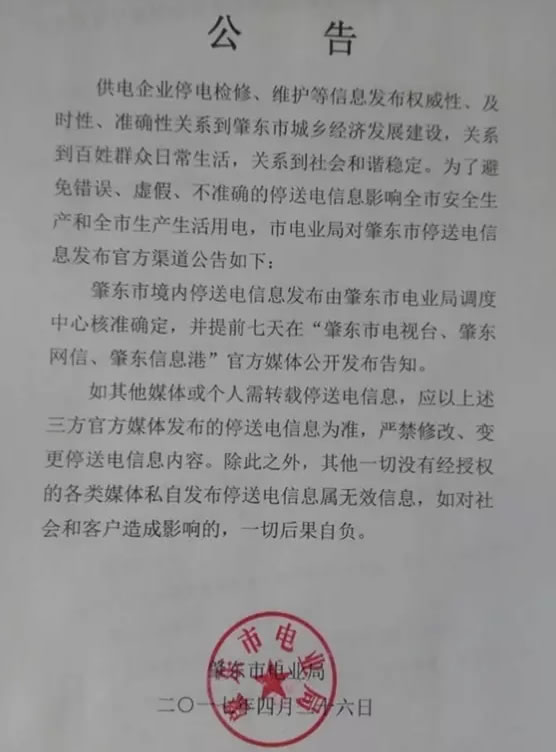 供電企業(yè)停電檢修、維護等信息發(fā)布權(quán)威性、及時性、準(zhǔn)確性關(guān)系到肇東市城鄉(xiāng)經(jīng)濟發(fā)展建設(shè),關(guān)系到百姓群眾日常生活,關(guān)系到社會和諧穩(wěn)定。為了避免錯誤、虛假、不準(zhǔn)確的停送電信息影響全市安全生產(chǎn)和居民生活用電,市電業(yè)局對肇東市停送電信息發(fā)布官方渠道公告如下: