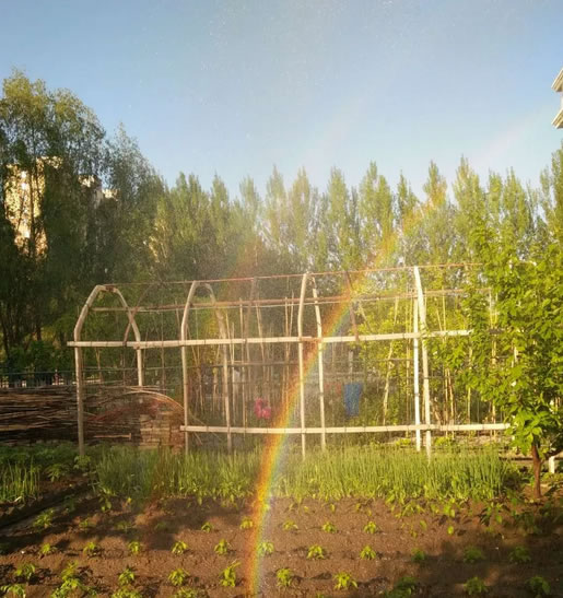 滕立坤是菜園主人,退休后以侍弄樓前5分小菜園為樂趣。由于連日高溫干旱,5月30日6時許,他在自家水井上按泵通電,將水管連接起噴頭綁在竹竿子上,在菜園子的上空高高豎起,開始噴水澆園抗旱,出乎預料的是在陽光的照射下,水霧中驚奇般的出現(xiàn)了一道亮麗的風景線。我趕緊用手機記錄下了那精彩的瞬間,吸引了數(shù)十名晨練的人們駐足觀看。