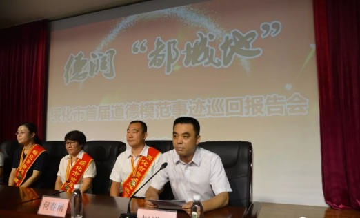 報告會上,少先隊員向五位道德模范進(jìn)行了獻(xiàn)花,隨后,何春雨、陳立艷、喬馥、李慶云、張旭旺五位道德模范代表分別結(jié)合自身工作和生活經(jīng)歷為現(xiàn)場觀眾做了感人至深的事跡報告。五位代表用一句句樸實(shí)的語言,生動的事例,講述了他們一件件平凡感人的事跡,分別從不同層面、不同角度詮釋了社會主義道德的內(nèi)涵,展現(xiàn)了社會主義道德的風(fēng)范。他們無私奉獻(xiàn)、樸實(shí)無華的故事打動了現(xiàn)場所有觀眾。